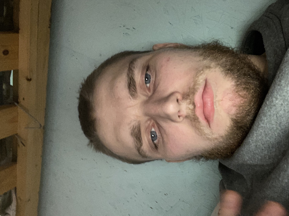 A man with light skin, blue eyes, and a full beard is facing the camera