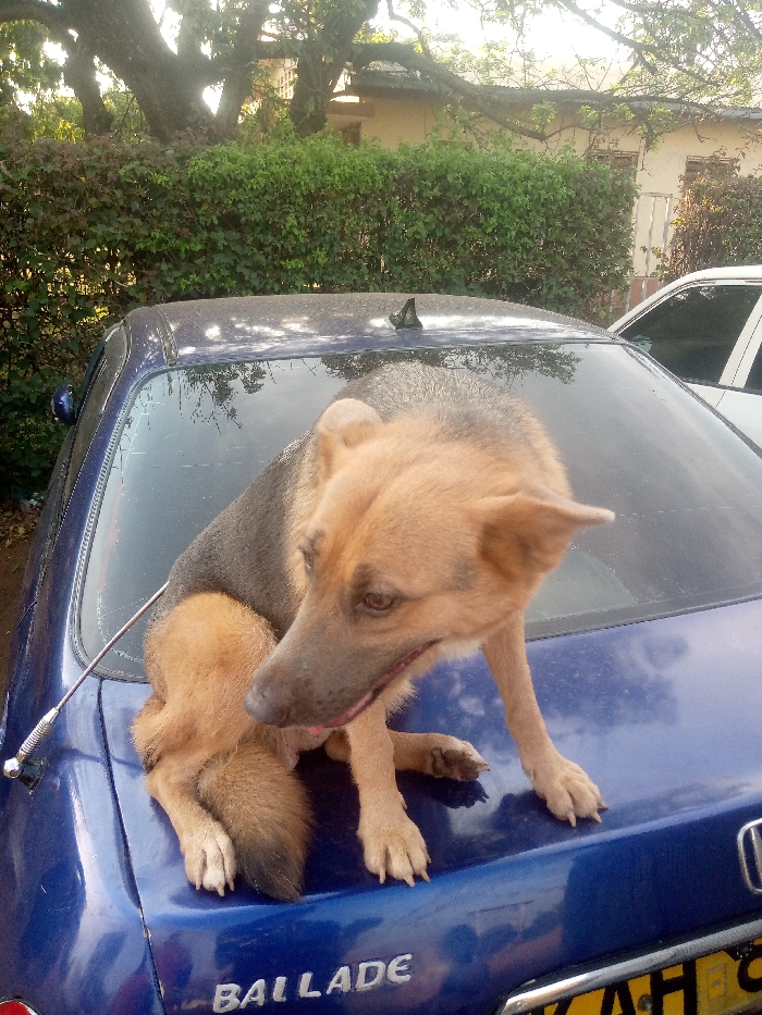 A medium-sized dog, exhibiting tan, dark brown, and grey fur, is positioned on the dusty blue trunk of a Honda Ballade sedan. The dog's ears are erect, and its dark muzzle shows a slightly protruding pink tongue as it gazes downwards and to the right. A metallic antenna extends from the left rear fender of the vehicle. The partially visible rear license plate begins with "KAH," indicating a Kenyan registration. The background features a dense green hedge, behind which are two light-colored residential structures and mature trees with full foliage. A portion of a white sedan is visible to the right of the blue car. The scene is located outdoors in Kisumu, Kenya.
