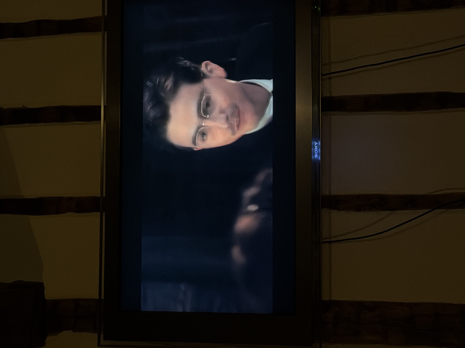 An indoor scene in Mauléon-d'Armagnac, France, depicts a dark-framed Sony television displaying a film or program. The screen features a male subject from the chest up, positioned slightly right of center. The man has dark, neatly styled hair, wears small, round, wire-rimmed spectacles, and a light mustache. He is dressed in a white collared shirt beneath a dark jacket or suit, and his mouth is slightly open, suggesting speech or an upcoming utterance. A blurry, out-of-focus human figure or object is partially visible to the left on the screen. The television is situated against a wall characterized by prominent dark wooden beams arranged vertically and horizontally, contrasting with the lighter, possibly cream-colored, plastered sections. Two dark cables descend vertically from behind the television along the wall. The ambient lighting in the room is dim, with the television screen being the dominant light source for the depicted content.