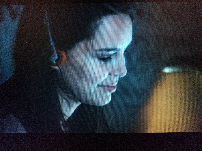 A still image depicts a female subject in profile, oriented to the right, situated within an interior environment in the city of Issy-les-Moulineaux, France. Her face is primarily illuminated by a cool, blue-toned light, displaying distinct vertical striations consistent with light emitted from an electronic screen. She possesses dark hair and her lips are subtly parted, conveying a calm or thoughtful expression. An orange earbud is visible behind her left ear, connected by a dark cable. A slender, dark, vertical object, consistent with a microphone arm, is positioned behind her head. The background is largely dark and out of focus, with a blurred vertical area of warm, yellow-orange light visible to the right of the subject, indicative of another light source or reflective surface. The scene suggests engagement with an electronic device or communication equipment in a low-light setting.