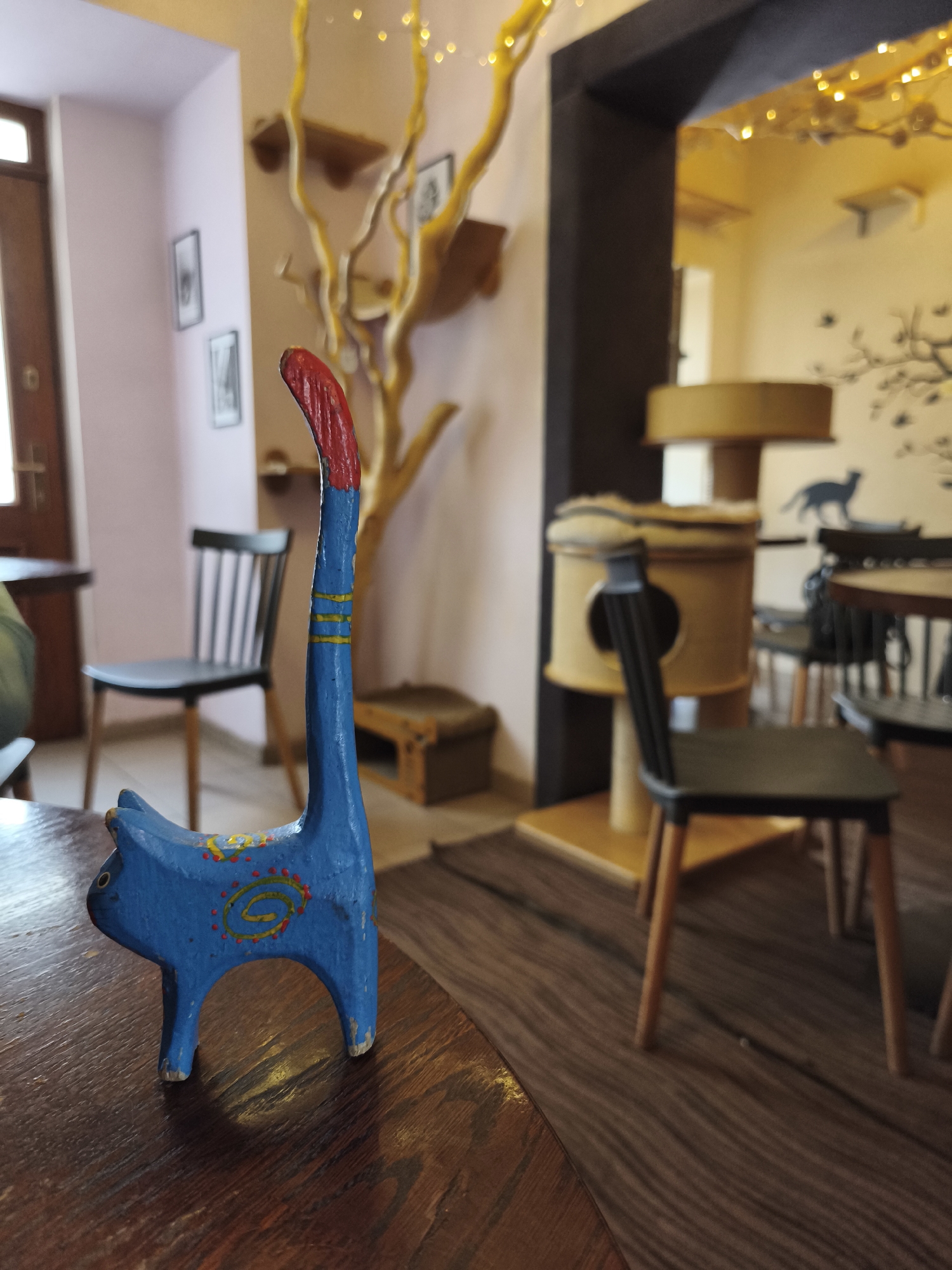 The image, taken indoors, likely in a cat café in Krakow, Poland, features a wooden cat figurine as the primary subject. The figurine is blue with a red tail and painted yellow and orange details. It sits on a dark, rounded wooden table with visible grain. In the background, a room scene unfolds, suggesting a café setting. A wooden door is visible on the left. A black chair is positioned behind the figurine. Further back, there's a decorative golden tree-like structure. To the right, an open doorway leads to another room with a cat tree. A black silhouette of a cat adorns the wall. Additional chairs and a table are visible in the background. String lights decorate the space above the doorway. The general ambience indicates a relaxed, cat-themed environment.