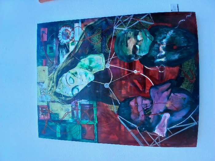 An abstract painting dominates the image. The artwork, hanging on a light blue wall, features four stylized faces rendered in contrasting colors. A pale, reclining face with closed eyes lies on the left, adjacent to a grid-like structure. Two dark, rounded shapes sit atop a red background on the right, and below them is another reclining figure in shades of purple and blue. A geometric, silver framework connects the four figures, adding a sense of surrealism and complexity to the composition.