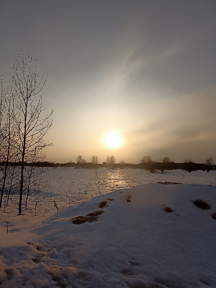 The image displays a snow-covered outdoor landscape in Serpukhov, Russia, under an overcast or hazy sky, with the sun low on the horizon, positioned slightly right of center and emitting a bright, warm light. In the foreground on the left, several bare deciduous trees with dark trunks and branches are present. The midground is a flat, snow-covered field, with sections exhibiting partially melted snow or ice reflecting the sun's glare. A snow mound in the lower right foreground contains multiple distinct footprints with dark earth residue. The distant horizon reveals a faint line of trees and structures. No individuals are visible within the frame.