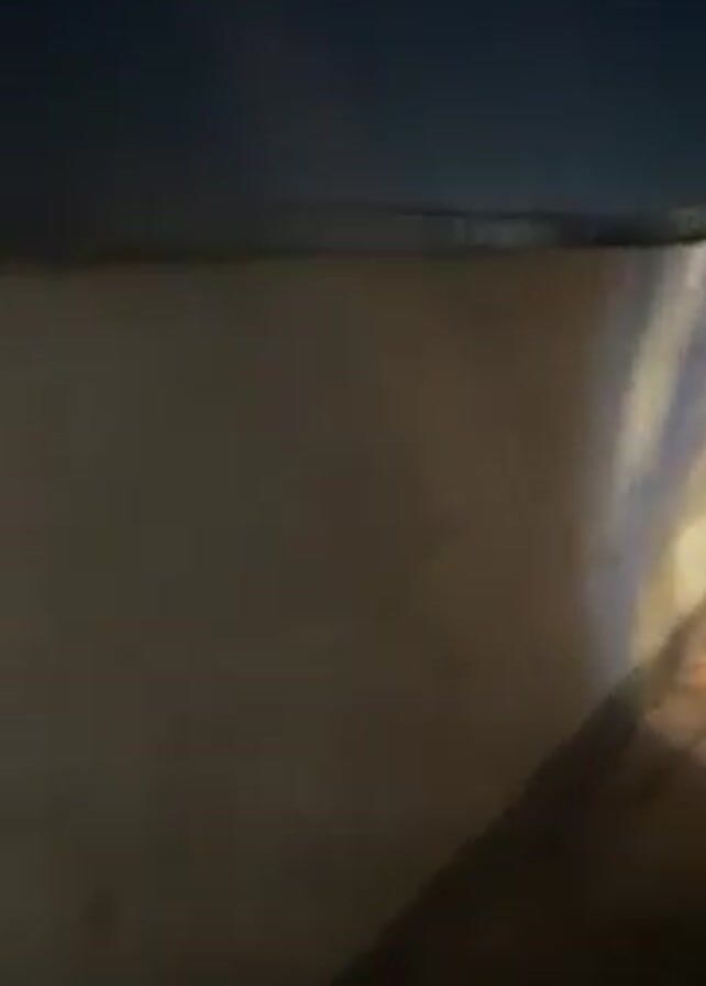 The video depicts a night scene viewed from a vehicle moving through a concrete tunnel. The tunnel's interior walls are visible, lit by the vehicle's headlights, which create stark light and shadow patterns on the rough surface. The top of the tunnel opens to a dark blue sky. The ground shows signs of dirt and tire tracks. The car continues moving forward within the tunnel.