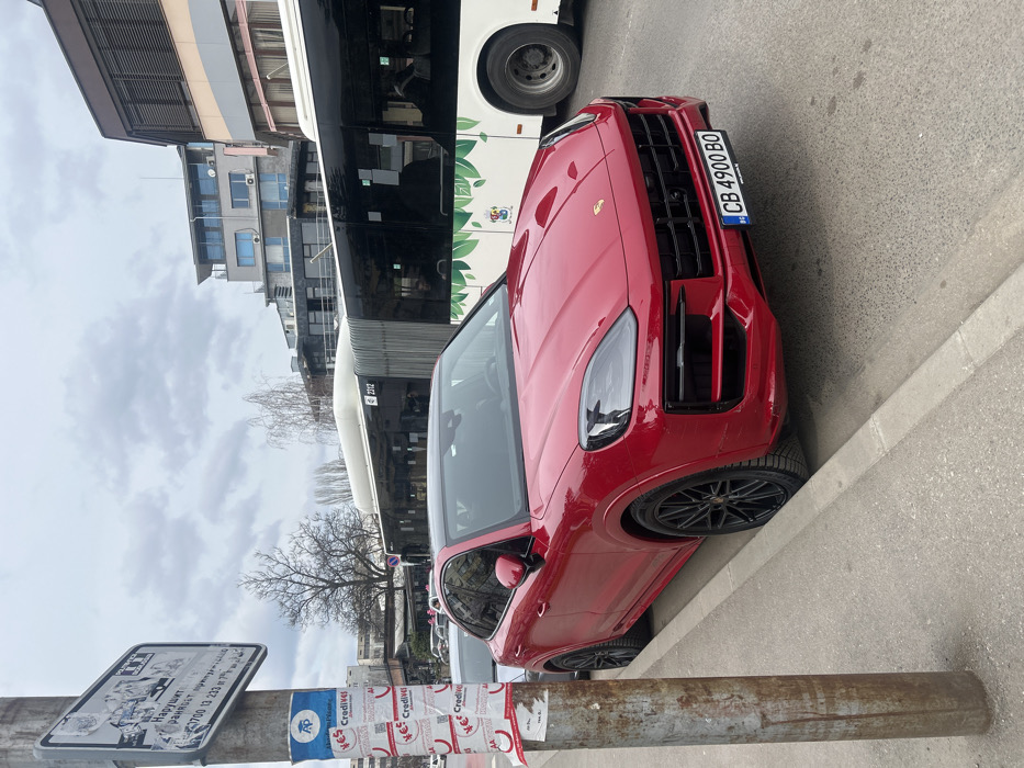 The image depicts an urban street scene in Sofia, Bulgaria, under an overcast sky. A prominent red Porsche Cayenne Coupe, bearing Bulgarian license plate "CB 4900 BO," is parked on the right side of the frame, parallel to a concrete curb. The vehicle features black multi-spoke wheels and dark-tinted windows. Minor scuff marks are visible on the lower left portion of its front bumper. To the left, a rusted, cylindrical metal pole stands vertically. Its lower section is covered with numerous white and red paper flyers, advertising "CrediYes" and "АВАНСОВИ ПАРИ" (Advance Money) in Cyrillic script. Above these flyers, a rectangular white sign with black Cyrillic text and graphics is attached to the pole, displaying text such as "Нарушител..." (Violator...) and contact numbers. In the mid-ground, a white articulated city bus, marked with the number "2312" and decorated with green leaf decals along its side, is visible on the street, positioned behind and to the right of the Porsche. Passengers are partially discernible through its tinted windows. Behind the bus, various multi-story urban buildings line the street, displaying diverse architectural styles, some with balconies, rooftop terraces, and visible air conditioning units. Sparse, bare deciduous trees are also visible in the background, suggesting a non-summer season. No individuals are clearly identifiable performing specific actions in the immediate foreground.