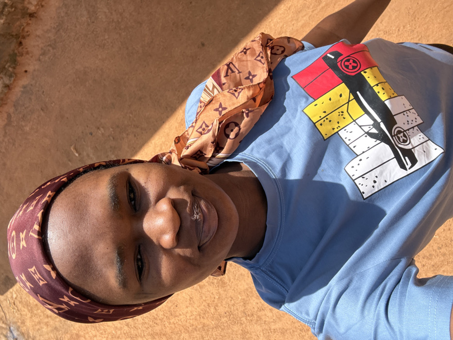 An outdoor, selfie-style photograph taken in Jos, Nigeria, depicts an adult female from the head to mid-torso