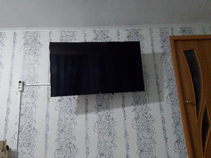 The image depicts an interior wall within a room in the city of Kuyeda, Russia. The wall is covered with wallpaper featuring alternating vertical stripes of light grey and a patterned design of grey roses on a white background. A large, rectangular, black-screen television is mounted on this wall, positioned centrally in the frame. To the left of the television, a white three-receptacle power strip is affixed to the wall, from which a white cable extends horizontally towards the rear of the television. On the right side of the frame, a light brown wooden door with a brass-colored doorknob and a frosted or textured glass panel is partially visible. The ceiling above the wall appears light in color. No individuals or specific actions are present in the scene.