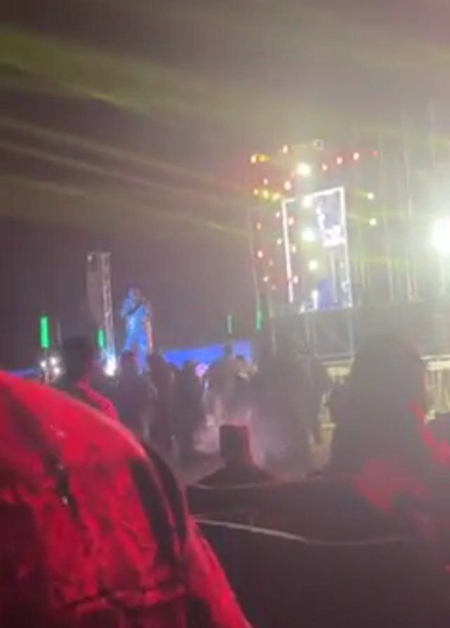 A video shows a concert stage at night. A performer in a blue outfit stands on a platform, visible against a backdrop of lights and screens. Yellow beams shine from above, adding to the vibrant atmosphere. The crowd is visible in the foreground, many with their backs to the camera, looking towards the stage. Smoke effects add to the visual spectacle. The view is partially obstructed by a person in a red jacket, positioned to the left of the frame. The overall impression is of a lively music event.