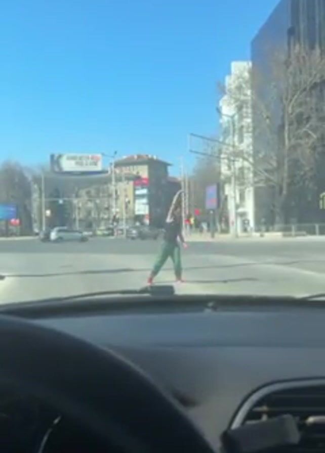 A person in green pants and a black top walks across a street in the middle of an intersection. They are juggling three red balls. The video is shot from inside a car, with the steering wheel visible in the foreground. There are buildings in the background and a clear blue sky. The intersection is a four-way stop with traffic lights. There are a few cars visible in the distance.