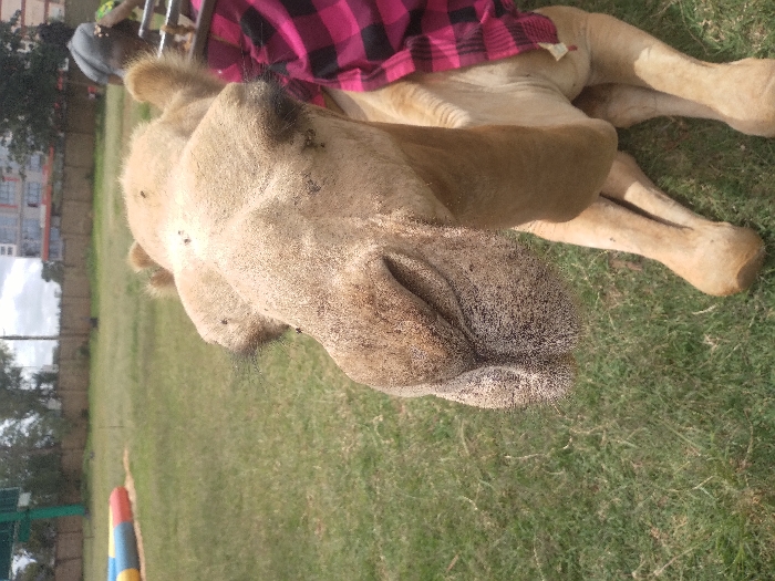 - "A light-tan dromedary camel is depicted seated on a sparse green and brown grassy field in Nyeri, Kenya" by FM-MlC902, licensed under CC BY 4.0