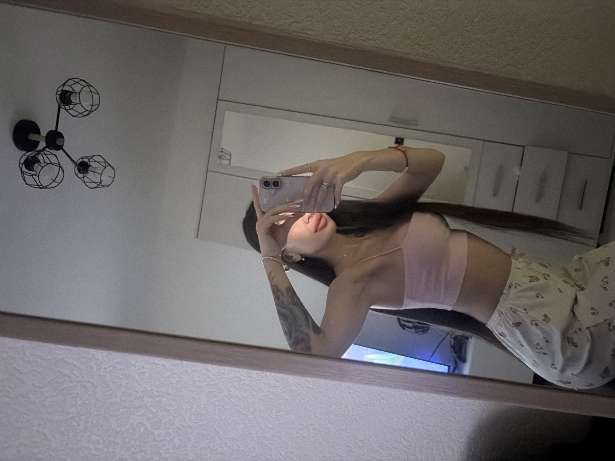 person taking a selfie in a mirror. The person is wearing a light pink top and white floral-patterned pants. They are holding a smartphone with two lenses in front of their face. A tattoo is visible on their left arm. The background shows a white wall with a black and gold light fixture and white cabinets. There is a television partially visible in the background behind the person. The location cannot be determined from this image alone.