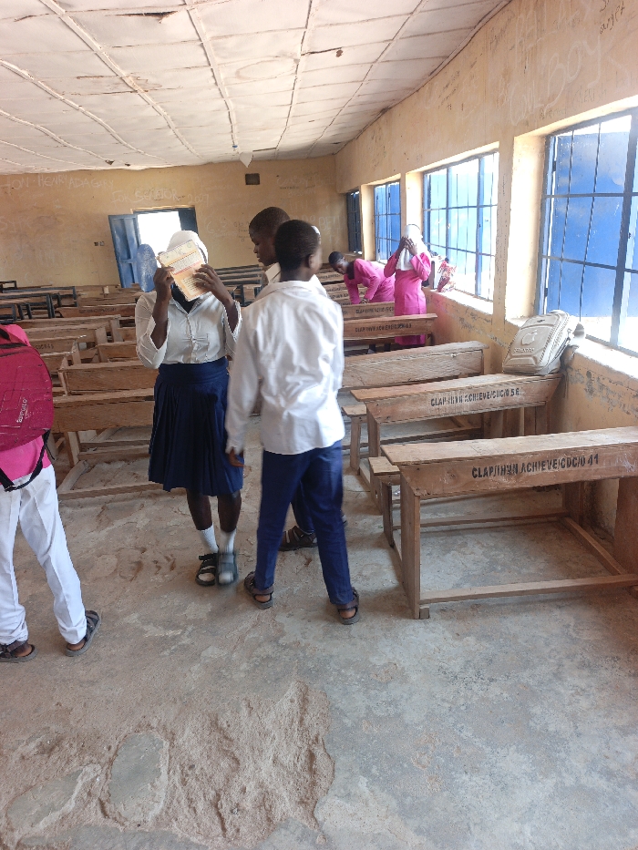 The image depicts an interior view of a classroom in Mada, Nigeria
