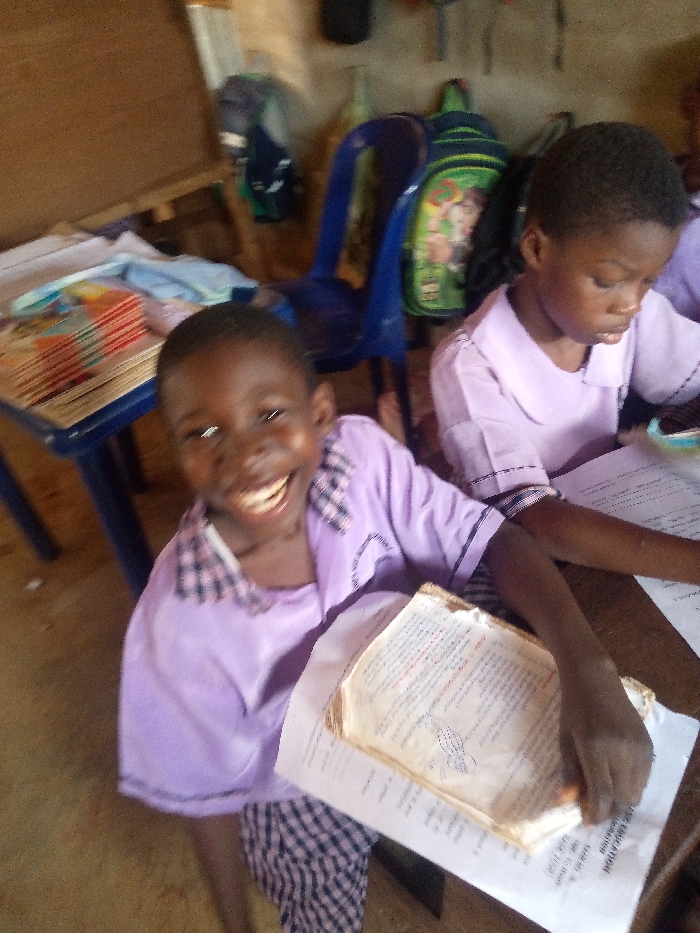 This image depicts an indoor scene, identified as a classroom in Onitsha, Nigeria