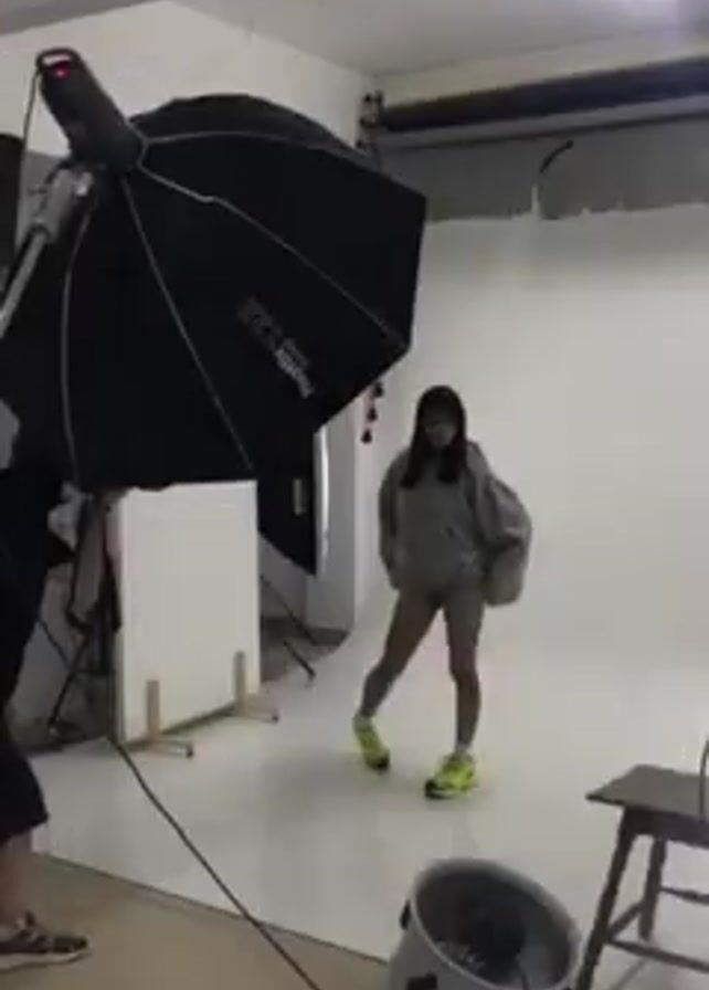 photo shoot in a studio. A young woman with straight black hair poses in a gray oversized hoodie, white socks, and bright green sneakers. She is standing on a white floor with a white backdrop. A large black umbrella reflector and other studio lights are set up around her. A photographer is visible, adjusting the equipment. A wooden stool is placed to the side.