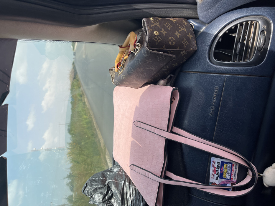 The image captures an interior view from a vehicle in Kwali, Nigeria, looking forward through the windshield onto a rural road during daylight hours. The vehicle's dark blue dashboard features an "SRS AIRBAG" label and an air conditioning vent on the right. Arranged on the dashboard are three items: a black, possibly tied bag on the left, a large light pink tote bag with a repeating patterned texture in the center, and a brown Louis Vuitton monogram handbag on the right. A small white, fluffy charm hangs from one of the pink tote bag's straps. A white sticker adhered to the dashboard under the pink bag's strap reads "Alhamdulillah WALIMAT QUR'AN Mallam ABDULATEEF ABDULFATA! 2nd NOV, 2025 COURTESY: FAMILY". Outside the vehicle, a two-lane asphalt road stretches into the distance, bordered by dense green and brown vegetation. The sky is clear blue with scattered white clouds. A communication tower is visible on the left side of the horizon, and distant landforms resembling hills or mountains are present. Other vehicles are faintly visible traveling on the road ahead in the distance. No people are visible.