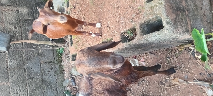 An outdoor enclosure or yard in the city of Unknown, Unknown, is depicted under natural daylight. The ground consists of reddish-brown dirt, sparsely covered with dry leaves, twigs, and several discarded plastic bottles. Two animals are present, both facing the viewer. In the foreground on the left, a dark brown sheep, characterized by its shaggy coat and long, pendulous ears, stands looking directly at the camera. Its head and upper torso are visible. To the right and slightly behind, a lighter brown goat stands with shorter, more erect ears and a smoother coat. This goat has distinct white markings on its lower legs and hooves, and its body is largely visible. A low, weathered concrete block structure, possibly a trough or border, extends horizontally across the mid-ground, positioned between the two animals and just in front of the goat. Behind these animals, a gray, weathered concrete block wall forms the background. A slender, debarked wooden pole stands vertically near the wall, with a dark, possibly plastic, sack or bundle attached to its top. A single large, light green leaf is visible in the lower right foreground. No people are present.