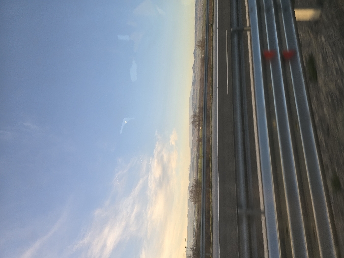 The scene depicts a landscape located near Polsko Padarevo, Bulgaria, observed from a low vantage point, likely through a glass surface due to visible light reflections in the upper portion of the frame. A multi-lane asphalt highway or expressway runs horizontally across the mid-ground, featuring a concrete barrier separating it from the foreground. Dominating the lower half of the image is a silver metallic guardrail, composed of multiple horizontal beams, which has two red rectangular reflectors affixed to its right side. Beyond the highway, the terrain is flat with scattered bare trees and low vegetation, extending to a distant horizon line where faded blue-grey hills or mountains are visible. The sky, occupying approximately two-thirds of the image, displays a clear blue hue that transitions to a lighter, yellowish tone near the horizon, with sparse, wispy white clouds present. No individuals or active subjects are discernible within the frame.