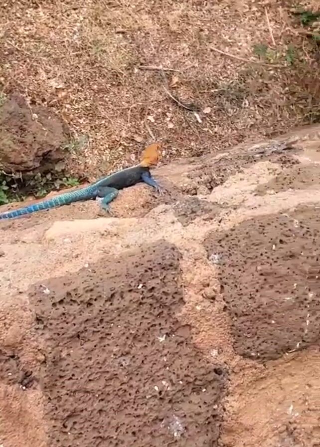 - "lizard with an orange head, a dark blue body, and a blue and green tail, walking on a porous, brown, rock wall" by FM-60W8y1, licensed under CC BY 4.0