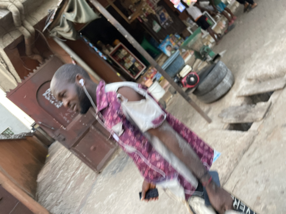 A man wearing a burgundy patterned shirt and an earbud walks on a slanted, possibly outdoor, concrete surface. He is holding a phone in his hand. In the background is a building with a closed brown door and a shop displaying various items. Behind the shop, there is a stack of tires and a generator or engine. The setting appears to be a street or alleyway.