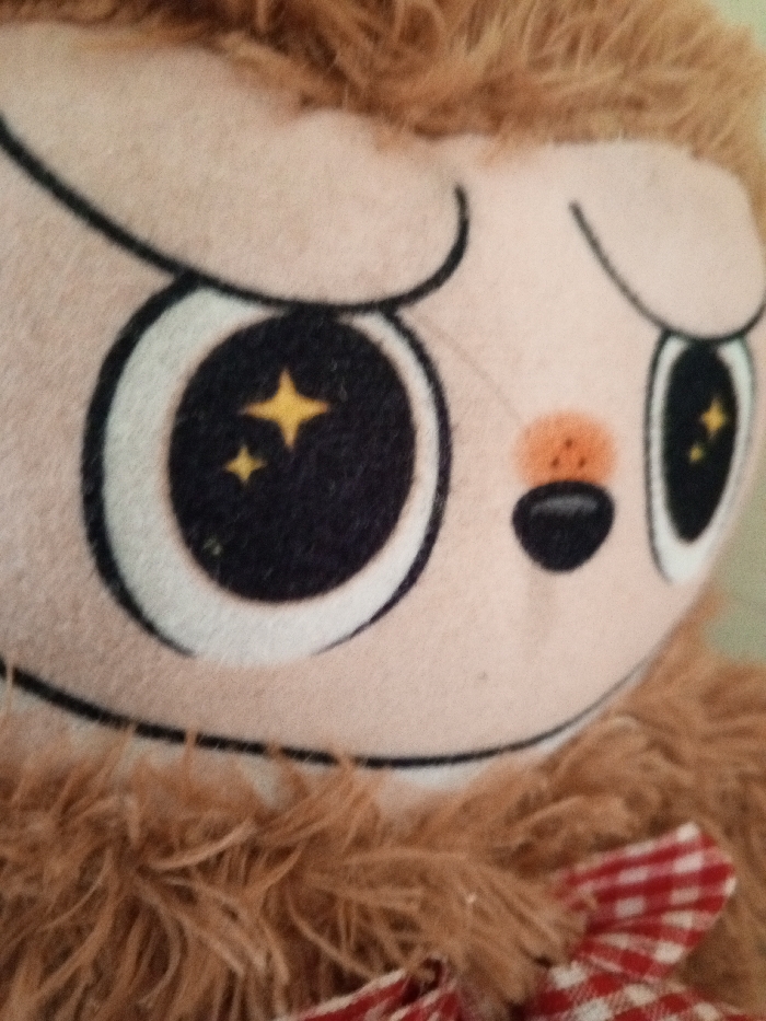A close-up of a plush toy's face. It has oversized eyes with white outlines and black pupils adorned with small yellow stars. A small, round orange nose sits above a black, oval mouth. The plush has fluffy brown hair and a red and white checkered bow around its neck. The overall expression is somewhat whimsical and childlike.