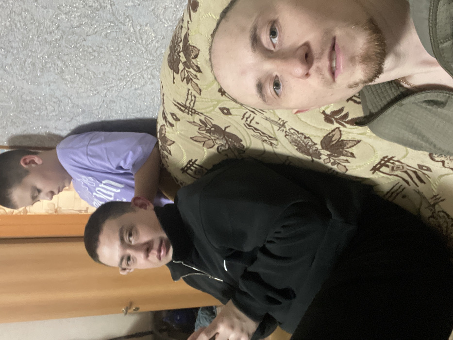 The image depicts three males within a residential interior in Nizhnii Bugrysh, Russia