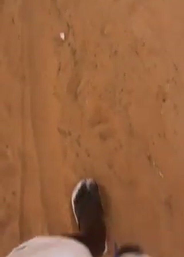 person walking on a sandy surface. The camera is positioned from a first-person perspective, looking down at the person's legs and feet. The person is wearing white shorts and dark-colored sandals. The sandy surface is light brown with some darker spots and tracks. The camera moves as the person walks.