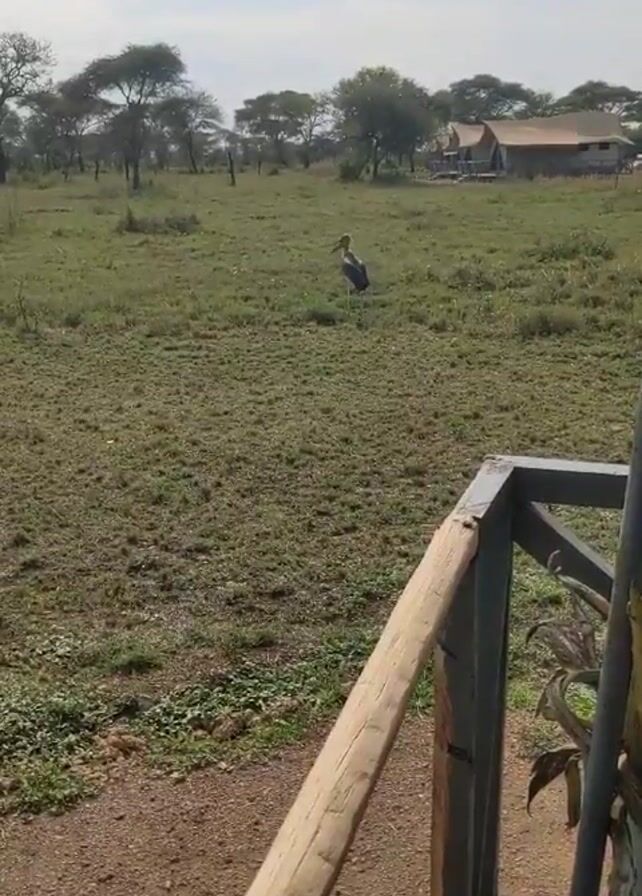 stork standing in a field from a point of view behind a wooden porch. The field is grassy and there are some trees scattered around. In the distance, there are several tan-colored, tent-like buildings. The sky is light blue with some white clouds. The stork is facing the viewer and has a gray body and a long, gray beak. The wooden porch is partially visible in the foreground. It is made of gray painted wood and has a wooden railing.