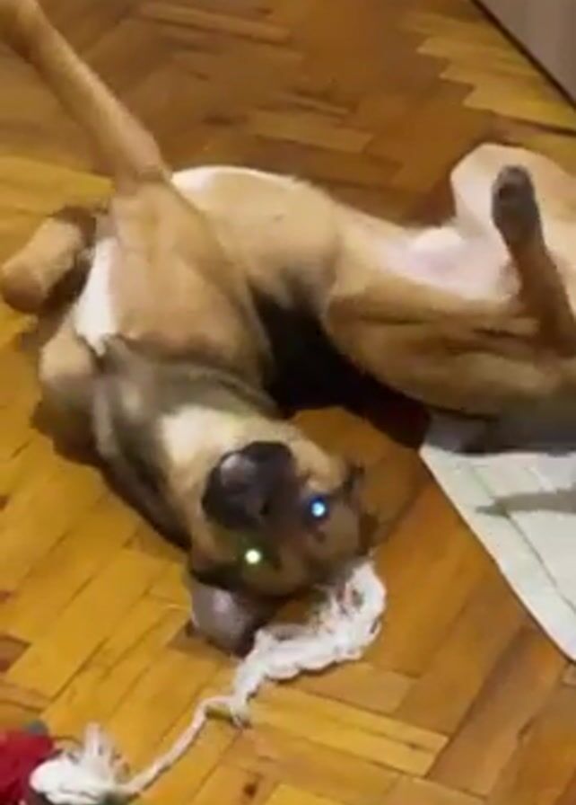 A medium-sized dog lies on its back on a wooden floor, with its legs in the air. The dog then flips onto its side. A torn-up dog toy lies near the dog.