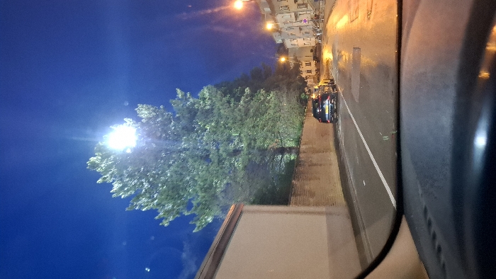 Night scene shot from an elevated position. A tall tree illuminated by a bright street lamp is visible against a dark blue sky. The street below is wet and reflects light. Buildings line the street, with a few cars parked or moving. A portion of the capturing vehicle's interior is visible in the foreground, suggesting the image was taken from inside a car.