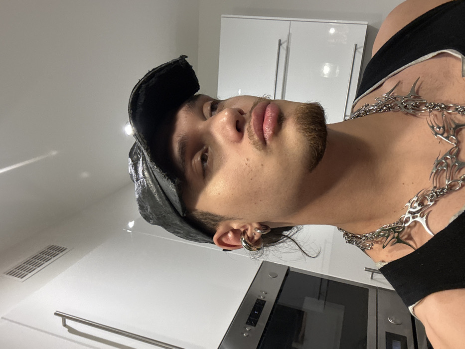 A male individual is depicted in a close-up portrait within a modern kitchen or utility room in Asnières-sur-Seine, France. The subject, positioned with his head slightly turned to the left and gaze directed off-camera to the right, wears a distressed, dark-colored baseball cap and a black sleeveless shirt with visible fraying on the collar. A prominent silver-toned chain necklace, featuring numerous interconnected, stylized tribal or flame-like links, is worn around his neck. The visible right ear displays two silver-toned piercings: a thick, large cuff on the upper helix and a smaller hoop in the lobe. The individual has a neatly trimmed goatee and mustache. The background consists of white walls, white integrated cabinetry, a built-in stainless steel oven or microwave appliance with a black glass door, a stainless steel cabinet handle, and a ceiling-mounted air vent.