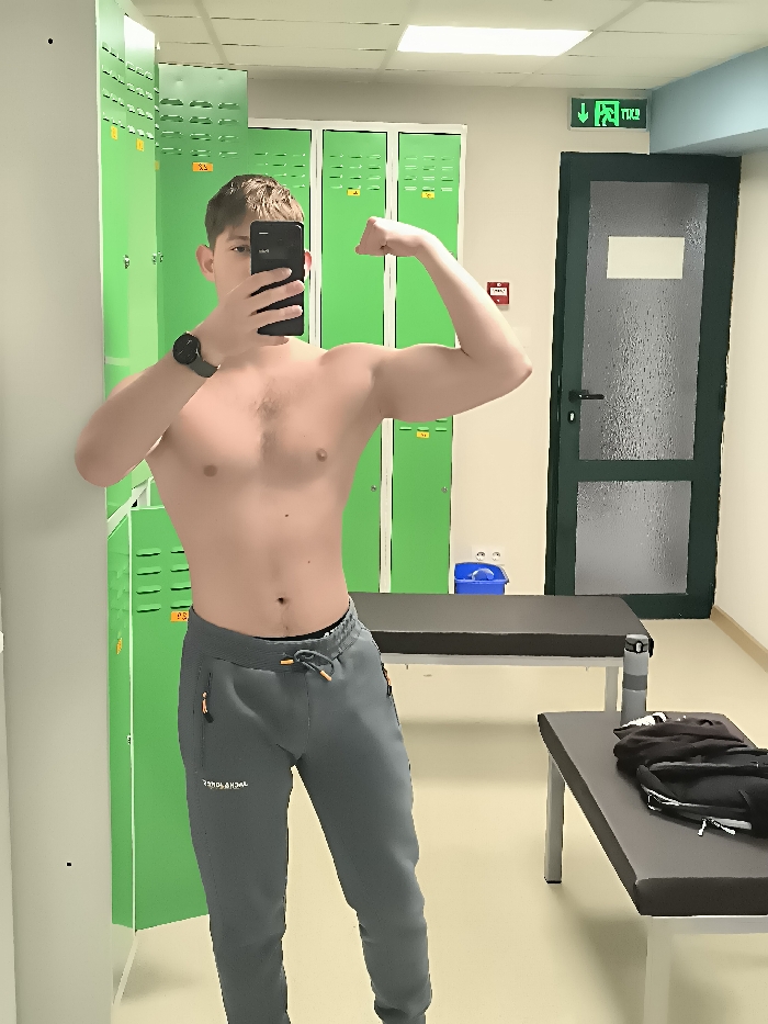 A young adult male, shirtless, with short brown hair, poses for a mirror selfie in what appears to be a locker room in Sofia, Bulgaria