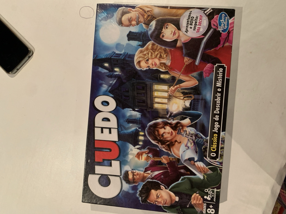 Cluedo game box. The cover features the game's title in large, bold lettering against a backdrop of a spooky mansion and a full moon. Illustrations of the classic Cluedo characters are displayed, including Miss Scarlet, Colonel Mustard, and Reverend Green. A text bubble announces the introduction of a new suspect, Dr. Orchid. The game box indicates it's suitable for ages 8 and up, for 2-6 players and the game is "O Clássico Jogo de Descobrir o Mistério". The Hasbro Gaming logo is visible.
