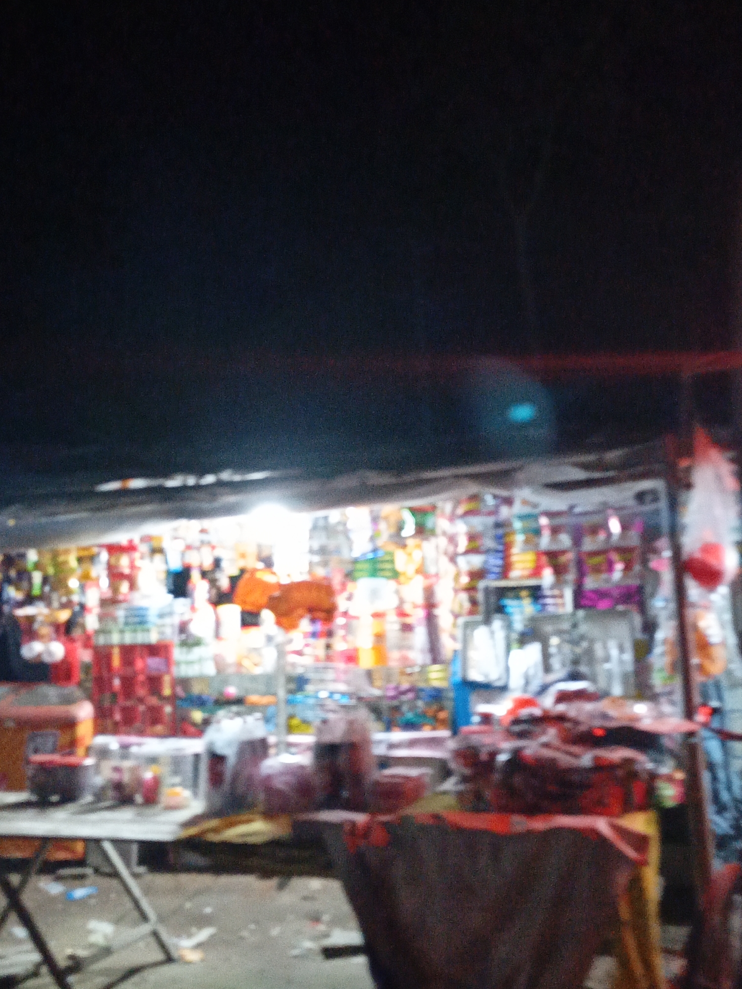 The image depicts a blurry, dimly lit scene in what appears to be a small shop or stall. The location is Unknown, Bangladesh. The shop is crammed with colorful merchandise, likely snacks, toys, and household goods, stacked on shelves and displays. In the foreground, there are tables cluttered with items covered with cloth. A metal folding table is visible to the left, partly obscured. The lighting is poor, with a dark sky. The photo is out of focus, but the setting is likely a roadside or marketplace environment.
