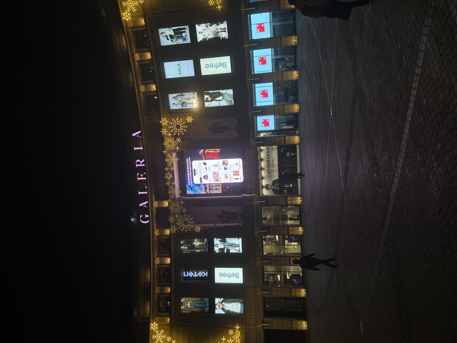A multi-story building, adorned with decorative snowflakes, displays "GALERIA" vertically in pink neon letters. Numerous storefronts and advertisements illuminate the facade. An electronic advertisement for a smartphone application is centrally located. People are seen walking on the paved ground in front of the building, with the surrounding area shrouded in darkness. Storefronts are bright and showcase merchandise.