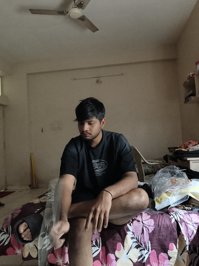 The image depicts the interior of a residential room, situated in Bengaluru, India. A young adult male is seated cross-legged on a bed covered with a floral bedspread featuring pink and white flowers on a dark background. He wears a dark-colored short-sleeved t-shirt with a white graphic print, dark shorts, and a black slipper on his left foot. A black elastic band is present on his right wrist. His gaze is directed downwards. His left arm is extended forward and slightly down, holding a transparent, elongated object, possibly a plastic strip or packaging, exhibiting motion blur around his hand. His right hand rests on his left shin. The room features light-colored walls and a white ceiling with a two-bladed ceiling fan. To the left, a light-colored door and two yellow cricket bats are visible leaning against the wall. In the background on the right, a white plastic chair is partially visible, along with a multi-tiered shelf containing various items. A clear plastic bag with white and yellow packaging is present on the bed to the right of the subject. The floor, partially visible in the lower left, appears to be tiled, with a dark red mat. The scene is illuminated by ambient daylight.