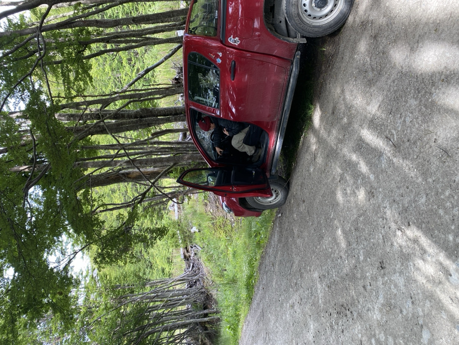 A red pickup truck is parked on a gravel road, its door open. A person sits in the driver's seat. The scene is surrounded by a forest with tall, slender trees and vibrant green foliage. The truck is positioned diagonally in the frame, and the lighting casts shadows on the road and the truck's body.