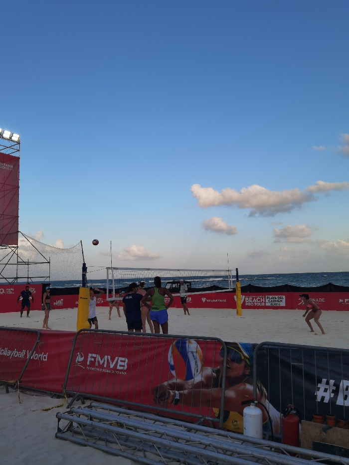 beach volleyball game taking place on a beach in Playa del Carmen, Mexico, at the coordinates 20