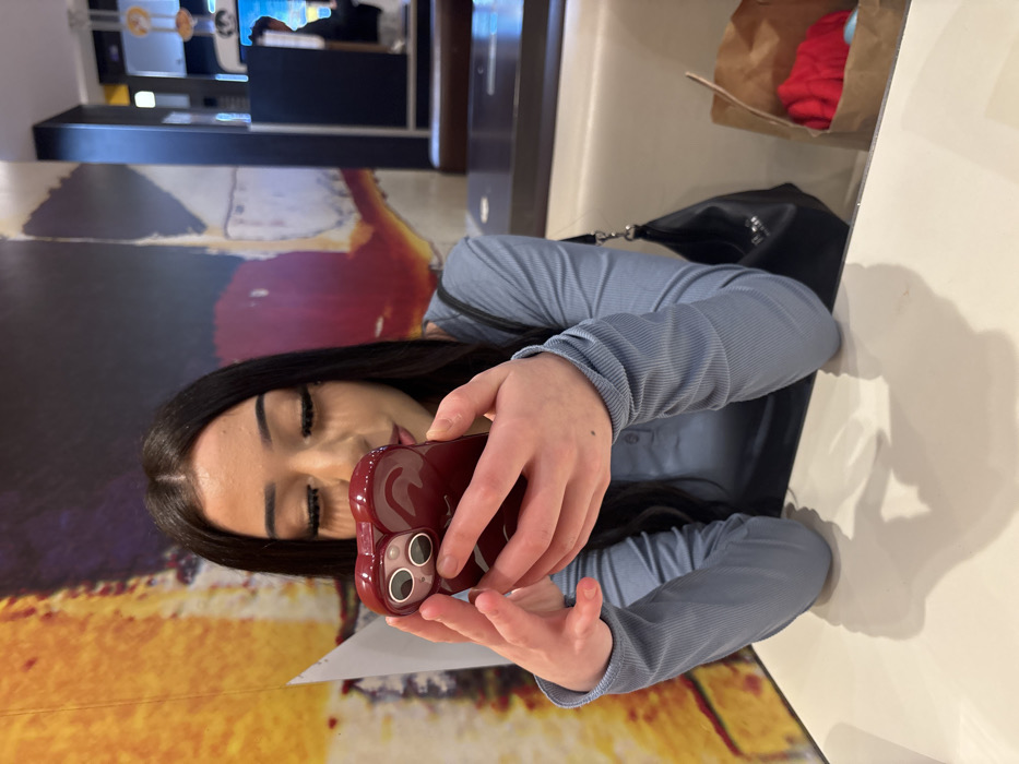 A young female is seated at a white table within a McDonald's restaurant in Strasbourg, France, consistent with the interior design of the McDonald's at Place Kléber. The subject has long dark hair, pronounced eyelashes, and wears a light blue ribbed long-sleeved shirt. She holds a smartphone, encased in a dark red, heart-shaped cover revealing dual camera lenses, with both hands, directing her attention downwards at its screen. A black shoulder bag with a silver chain strap rests beside her on the light-colored booth seating. To her right, a brown paper bag contains red and light blue fabric items. The background features a large, abstract wall mural with broad strokes of yellow, orange, red, and purple. Dark tables and additional booth seating are visible further back, along with a partially obscured individual standing in the distance.