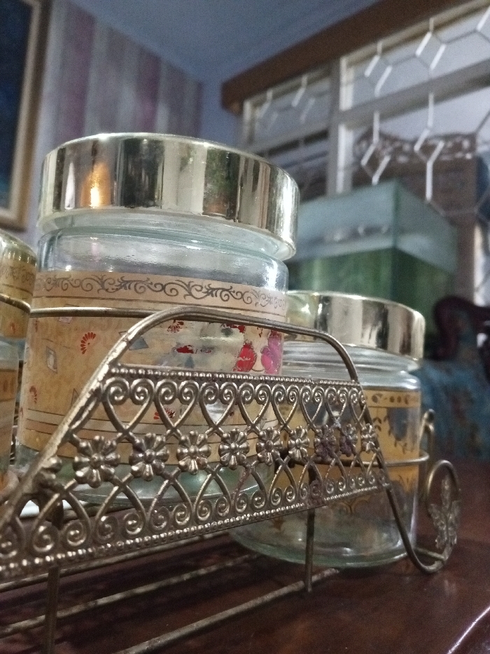 This image, taken in Longmiang, Laos, depicts a close-up, upward-angled view of several glass jars arranged in a decorative metal rack within an indoor setting. In the foreground, a multi-tiered rack made of aged brass-toned metal is visible. The rack features intricate filigree with repeating heart-shaped scrolls and six-petal floral motifs. Several clear glass jars are situated within and behind this rack. Each jar possesses a reflective, gold-colored metallic lid. The jars are encircled by decorative labels or sleeves that display ornate scrollwork along the top edge and patterned designs below, including floral elements in red and pink hues on a light, textured background. The objects are positioned on a dark, polished wooden surface, which forms the bottom edge of the frame. In the mid-ground, a wall with subtle, light-colored vertical stripes is visible on the left, along with a portion of a framed object, possibly artwork, in a dark frame. The background is out of focus, revealing a window with white, diamond-patterned grilles. Beyond the window, indistinct objects include a teal-colored rectangular shape and a darker green box-like item, suggesting an indoor environment with natural light sources and potentially other furnishings. No people are present in the scene.