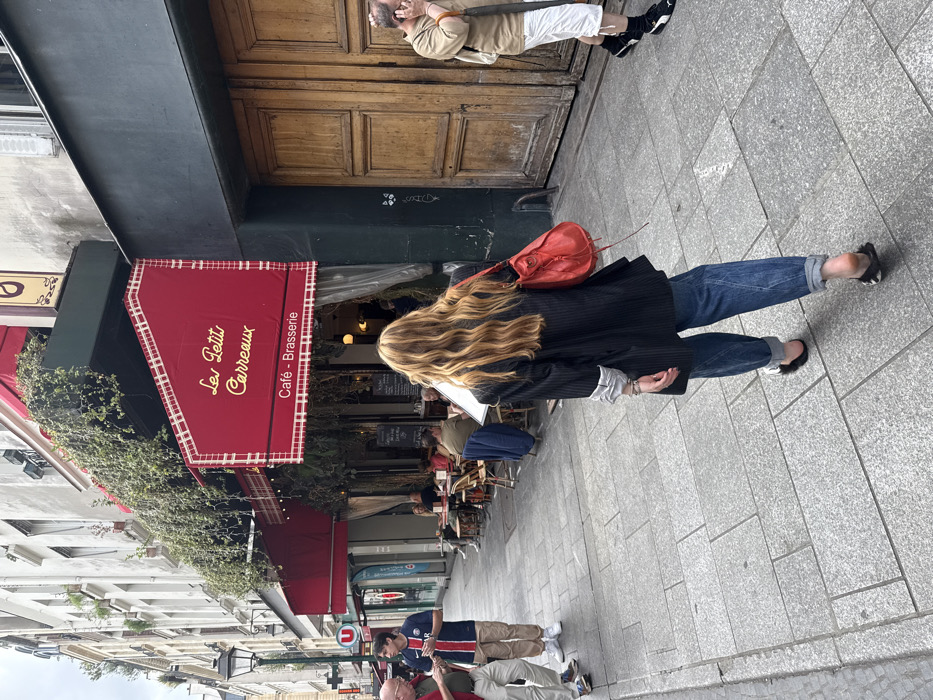 This image depicts a pedestrian sidewalk scene in front of "Les Petits Carreaux" Café - Brasserie, located at 17 Rue des Petits Carreaux, 75002 Paris, France. In the foreground, a female subject walks away from the viewer, slightly right of center. She has long, wavy, light brown hair and wears an oversized dark pinstriped blazer with rolled-up sleeves, blue cuffed jeans, and dark flat open-backed shoes. A bright red soft leather shoulder bag is carried on her right shoulder. The "Les Petits Carreaux" establishment is characterized by a prominent red hexagonal awning with "Les Petits Carreaux" in yellow script and "Café - Brasserie" printed below, bordered by a white grid pattern. A secondary red awning extends over an outdoor seating area furnished with multiple small tables and chairs, most occupied by patrons. Green foliage trails from above the cafe's facade. A large black sandwich board menu stands near the cafe's entrance. To the right of the cafe, a dark building facade features a large, weathered double wooden door. A man, partially cropped on the right, walks leftward past this door, wearing a light-colored polo shirt, white shorts, and black Puma slide sandals, holding a phone to his right ear. On the left side of the sidewalk, a dark ornate lamppost is visible. Further down the street, two male individuals walk away from the viewer: an older, bald man in a red polo shirt and light pants, and a younger man wearing a dark blue Paris Saint-Germain soccer jersey, light cargo pants, and white sneakers, appearing to interact with a device in his hands. A red "U" logo (suggesting a metro station) and a blue banner are visible in the background. The sidewalk is paved with light grey rectangular stone slabs. The sky is overcast.