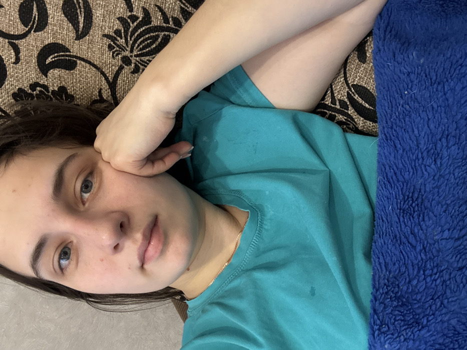 A young woman with fair skin, light eyes, and dark hair lies on a couch. Her head is angled towards the camera, with her left hand supporting her cheek. She wears a turquoise t-shirt and a gold necklace. The couch has a floral pattern in dark and light brown tones. A blue fuzzy blanket partially covers her torso. Her expression is relaxed and neutral.
