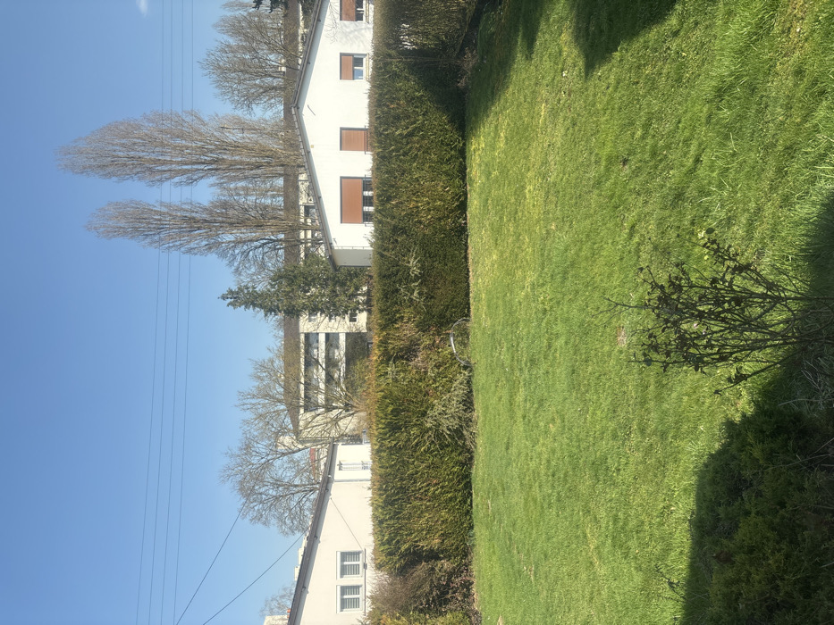 The image displays a residential landscape in Jarny, France, under a clear blue sky. The foreground is dominated by a neatly maintained green lawn, with shadows cast in the lower left and right corners. A small, leafless shrub is visible in the lower right. A dense, green hedge, acting as a property barrier, extends horizontally across the mid-ground. A small evergreen sapling is partially visible within the hedge to the left of center, and a segment of a white, arch-shaped metal object is seen emerging from the hedge directly above the lawn. In the background, behind the hedge, multiple structures are visible. To the left, a white single-story building with two windows featuring light-colored closed shutters is present. To the right, another white single-story building exhibits two windows with brown rolled-down shutters. Centrally located in the deeper background is a larger, multi-story residential building with a light-colored facade and visible balconies. Numerous deciduous trees with bare branches are scattered across the background, including two notably tall, slender trees on the right. A smaller evergreen tree is situated between the two single-story buildings. Overhead, thin utility lines traverse the clear blue sky. The scene is devoid of people or active subjects.