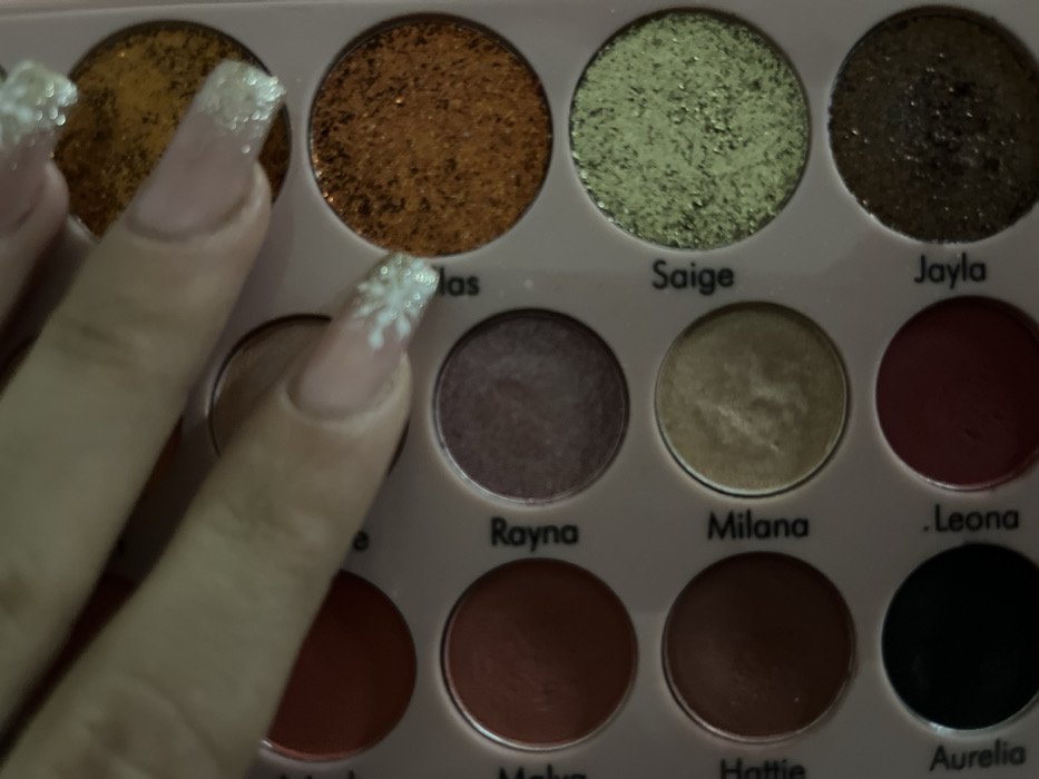An eyeshadow palette is visible, featuring round pans of varying colors and textures. The colors range from orange glitter to muted browns, greens, and golds. Beneath each pan, a name is printed, identifying shades like "Dallas," "Saige," "Rayna," and "Milana." A hand with decorated nails is partially covering the palette, obscuring some of the shadows. The palette's casing is a light pink or neutral color.