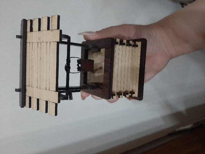 A hand, located in Barza Municipality, Syria, holds a miniature wooden well model. The model features a dark brown wooden frame supporting a light brown slatted roof and a well structure with interlocking light brown horizontal planks and dark brown vertical corner pieces. A small, dark brown bucket hangs suspended by a dark cord or wire within the well's opening. The hand, visible from the wrist upwards, has light-toned skin and visible fingernails on the thumb and index finger. The background consists of a plain, light-colored wall.