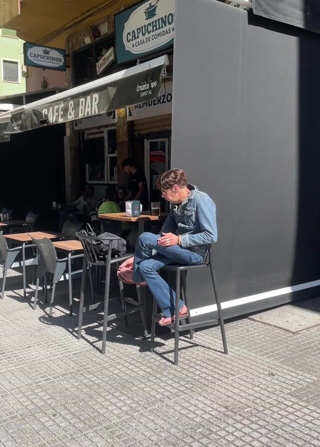 - "man sitting on a tall black stool outside a cafe and bar" by FM-yO6Bi1, licensed under CC BY 4.0