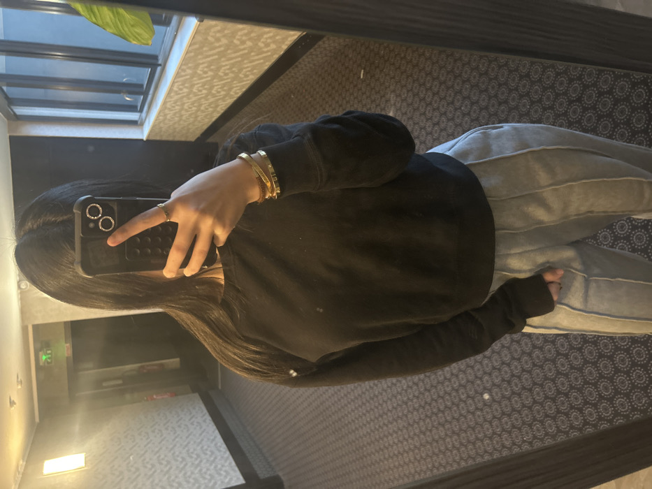 This is a mirror selfie taken in what appears to be a hotel or apartment building hallway in Unknown, Unknown. The image captures a person from the upper torso down, holding a black smartphone with a textured case and decorative rings around its camera lenses in their right hand, obscuring their face. The person has long, dark hair, parted centrally. They are wearing a plain black, long-sleeved crew-neck sweatshirt and light grey sweatpants with prominent vertical seams down the front of each leg. The right wrist displays multiple gold-toned bracelets, including one with text and another with small stones, and a gold-toned ring is on the right ring finger. The reflected environment shows a hallway with a dark patterned carpet featuring repeating circular motifs. The wall to the left is adorned with a light-colored, textured wallpaper. A rectangular wall sconce emits light from the upper left. Further down the hallway, an "EXIT" sign with a green arrow is visible above a dark door, and a red fire extinguisher is mounted on the adjacent wall. To the right, a set of windows with dark frames is reflected, and the partial view of a green plant leaf is visible near the window. The hallway extends into the background, suggesting depth.