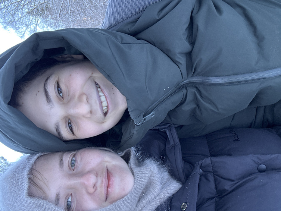 A close-up, eye-level photograph features two smiling individuals outdoors in Bellagio, Italy, during winter conditions. The person on the left is a fair-skinned individual with light eyes and light brown hair, wearing a light beige knitted hood or balaclava and a dark blue puffer jacket. The brand "Acne Studios" is faintly visible on the inner lapel of the left jacket. Their lips are slightly parted in a smile. The person on the right is a darker-skinned individual with dark hair and brown eyes, wearing a dark green hooded puffer jacket with the hood pulled up. A grey textured backpack strap is visible on their right shoulder. They exhibit a broad smile, exposing teeth. Both subjects look directly towards the camera, positioned intimately close to each other. Small white flakes, indicative of snow or frost, are visible on their jackets. The background is an out-of-focus winter landscape of bare, possibly snow-dusted, tree branches under soft, ambient light.