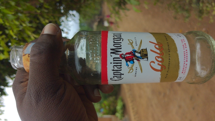 - "A dark-skinned human hand securely grips a capless, mostly empty 200ml clear glass bottle of "Captain Morgan Gold Rum Flavoured Spirit Drink" (35% Alc" by FM-QrecA3, licensed under CC BY 4.0