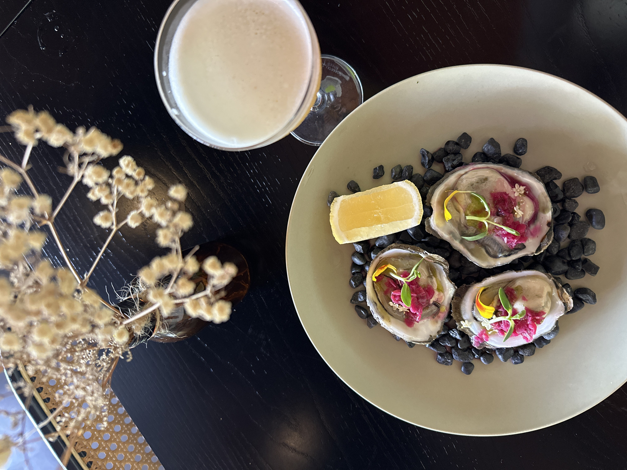 The image displays an overhead view of a meal setting in Canggu, Indonesia, likely within a restaurant environment. The central focus is a light beige-colored, oval plate containing three prepared oysters in their half-shells. Each oyster is garnished with a vibrant magenta relish or finely chopped ingredient, a sprig of green micro-greens, and a yellow flower petal or small white edible flower, resting on a bed of small, dark, polished stones. A rectangular lemon wedge is positioned on the plate near the top oyster. To the upper right of the plate, a clear coupe glass holds a pale yellow cocktail with a frothy top layer, indicating a foamy drink. The glass base shows the brand "RIEDEL". In the upper left background, a small brown glass vase holds dried, fluffy, light-colored decorative flora. The entire arrangement rests on a dark, textured table surface, possibly wood. A section of a light-brown, woven rattan pattern, possibly part of a chair or screen, is visible in the far upper left.