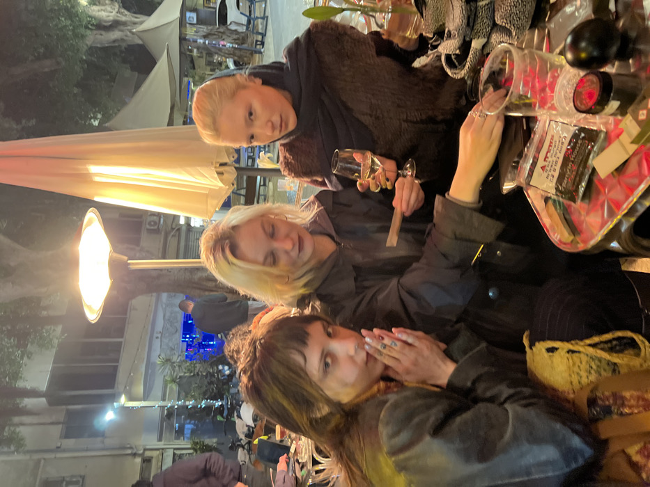 The image depicts three young adult females seated at an outdoor table at night, likely in a cafe or bar setting within the Kiryat HaMelacha neighborhood of Tel-Aviv, Israel